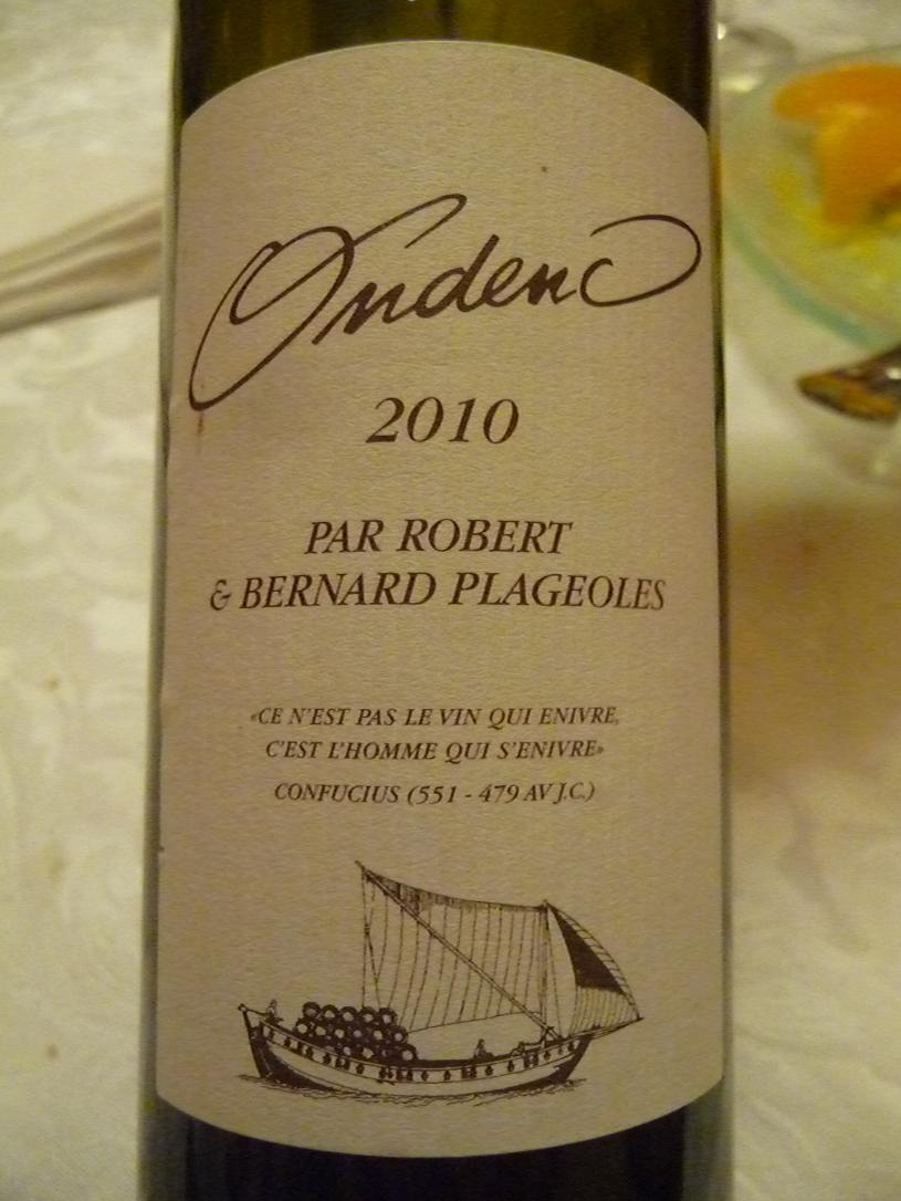 A l’issu de la dégustation, le repas fut accompagné du petit verdot du Domaine de l’Orviel **, d’un aramon 2011 du domaine de Sainte Croix ***, élégant et friand ; puis d’un alicante bouchet 1999 du Château de Puech-Redon **, rustique et un peu marqué par son âge ; et enfin d’un ondec 2010 (Gaillac doux) du Domaine Plageoles***, assez tendre et bien équilibré et d’un romorantin du Domaine Gendrier « tendresse » Cours-Cheverny 2005 **, légèrement oxydé fruité et d’une tendre douceur.