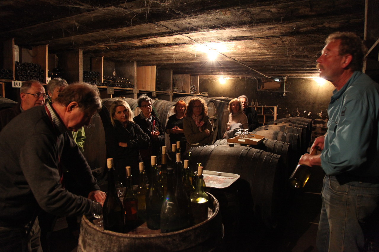 Après une petite balade dans Baume-les-Messieurs, un des plus beaux villages de France, Nous sommes attendus au Domaine Bourdy à Arlay. Jean Bourdy est un vigneron authentique qui pratique la biodynamie. Il représente la quinzième génération directe depuis 1475, et se dit « Créateur et conservateur des vins d’autrefois ». On trouve dans ses caves du XVe siècles, de (très)vieux millésimes qu’il est possible de déguster et d’acquérir.