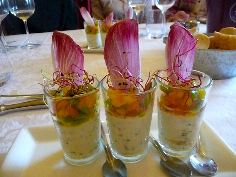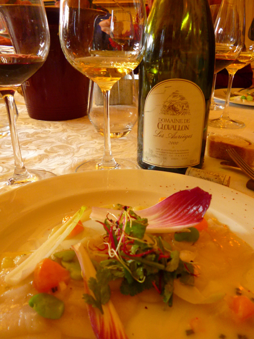 Pour accompagner dignement ces vins, Denis Roubaud, le chef du Bistrot d’Ariane, nous a proposé un déjeuner gastronomique aux influences cévenoles et méditerranéennes pour mettre en valeur ces vins au style fruité tout en finesse. En voici les détails et quelques commentaires.