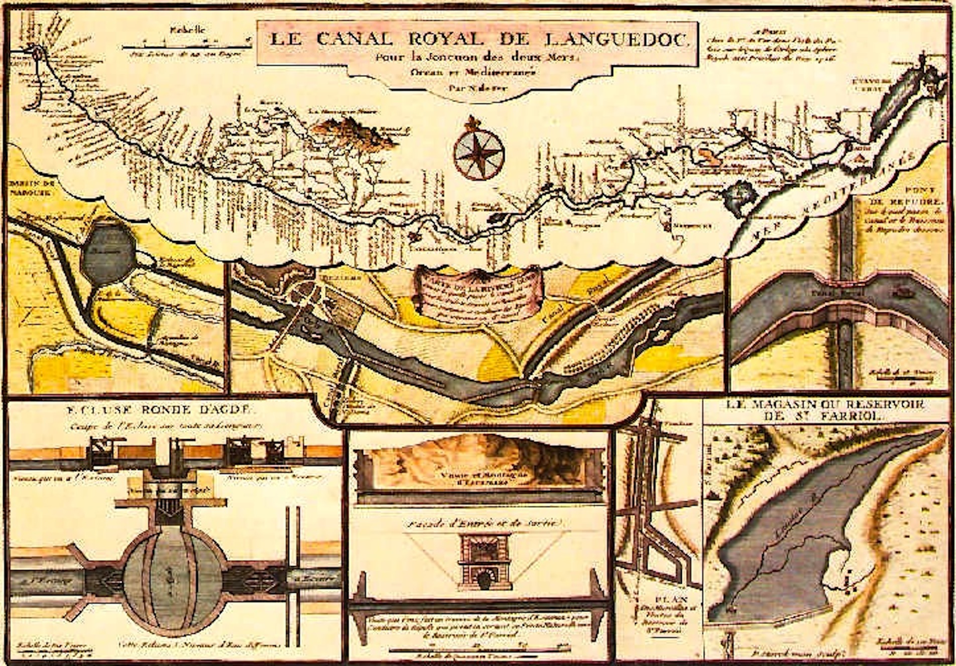 Conçu par Pierre Paul Riquet pour relier la Méditerranée à l’Atlantique et évitant les voies terrestres. Favoriser le transports du blé et du vin. Difficultés d’alimentation en eaux (bassin de St-Féréol), niveau d’horizontalité (nombreuses écluses dont l’écluse-escalier de Fontserranes ou l’écluse ronde d’Agde). Péages aux écluses et ponts.