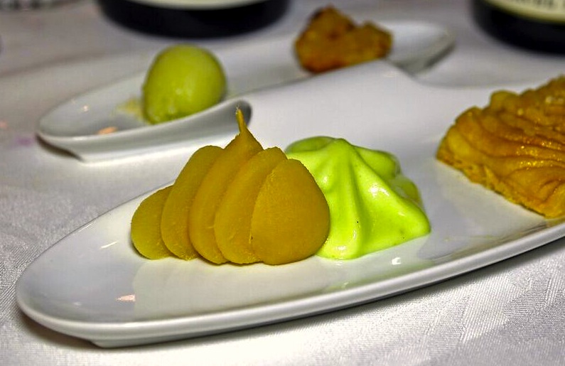 Tarte feuilletée aux pommes, poire pochée et émulsion Granny-Smith
