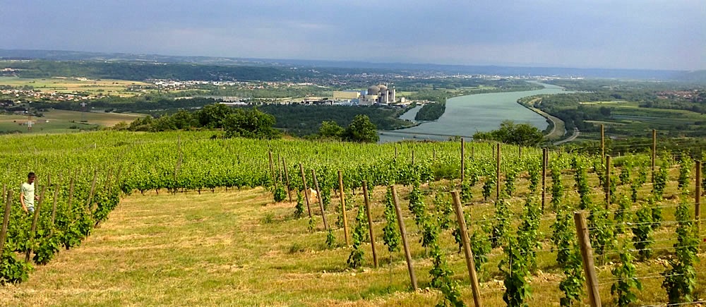Pour se rendre au Domaine du Monteillet depuis Chavanay, il faut emprunter une petite route départementale sinueuse, la D90, qui contourne le vignoble de Condrieu. Après avoir parcouru environ deux kilomètres, un petit panneau discret indique, sur la gauche, la direction à suivre. Au loin, se profilent quelques maisons en vieilles pierres marquant l’emplacement d’un hameau d’aspect bien modeste. Nous serions presque tentés de faire demi-tour sur le petit chemin qui nous y conduit, loin d’imaginer qu’au bout c’est un des domaines phares de la vallée du Rhône septentrionale qui nous attend. En poursuivant le chemin se découvrent alors les nouvelles installations du domaine agrandi en 2010 : chai, cave et caveau de réception, avec un superbe panorama sur la paisible plaine du Rhône et les vignobles de Chavanay.