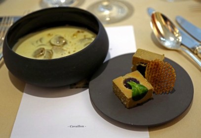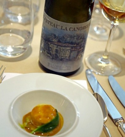 Nous commençons par un apéritif maison : le « Mélanis« , à base de melon. Ensuite nous avons choisi les vins blanc Château de la Canourgue 2016 en Luberon et le rouge Domaine de Fondrèche « Nadal » 2013 en AOP Ventoux. Je remarque cependant que pas un seul Côtes-du-Rhône-Villages Gadagne ne figure à la carte… Quel dommage !
