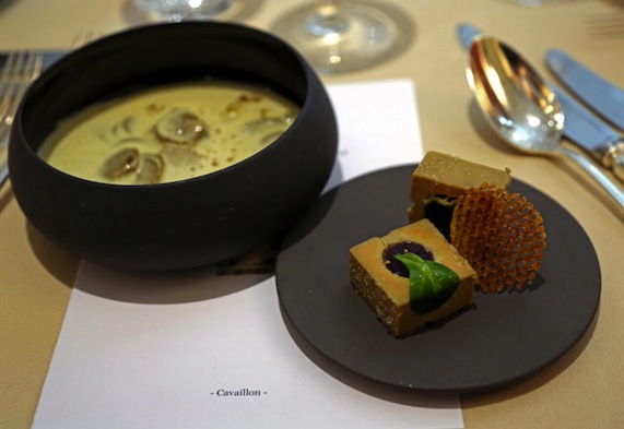 cube mi-cuit au vin épicé, pomme ratte à la cannelle et espuma de foie gras.