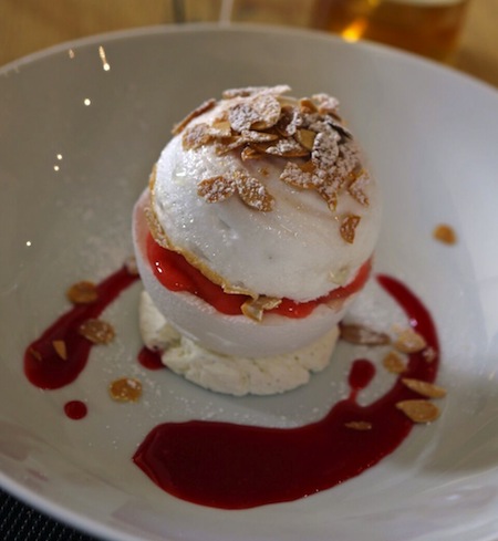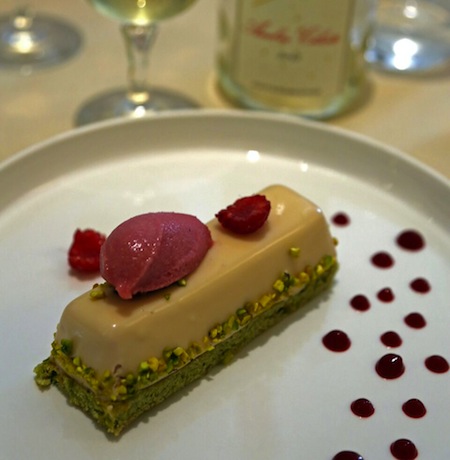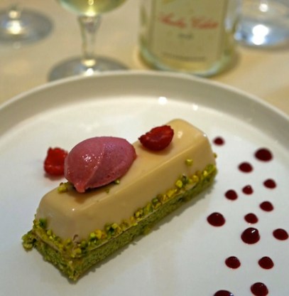 financier à la pistache et sorbet Ispahan.
