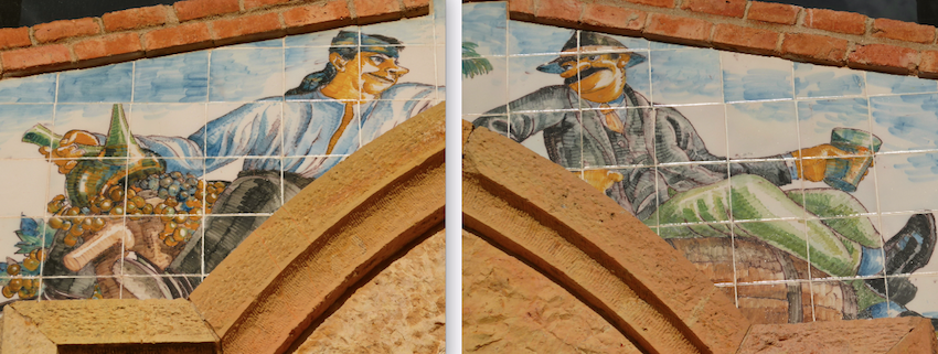 Les superbes dessins de la céramique, faits par Xavier Nogués, représentent des scènes traditionnelles de la vendange et de la cueillette des olives.