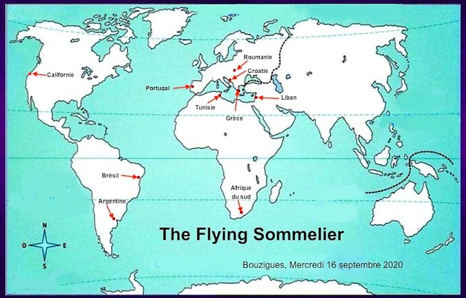 En cette douce soirée de fin d’été et à sa façon, le « Flying sommelier » nous a proposé de goûter d’excellents vins choisis sur tous les terroirs du monde. Voici quelques bouteilles « rapportées » du Liban, Brésil, Croatie, Grèce, Afrique du sud, Roumanie, Californie, Tunisie, Portugal…