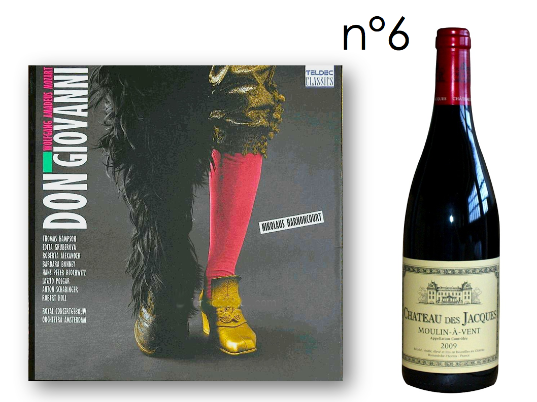 Posez sur le plateau un camembert de Normandie affiné. Versez dans les verres un gamay d’une bonne année provenant de la charmante commune de Romanèche-Thorins et son moulin-à-vent emblématique. Enfin, posez sur la platine le CD de Don Giovanni, l’opéra du génial autrichien.
