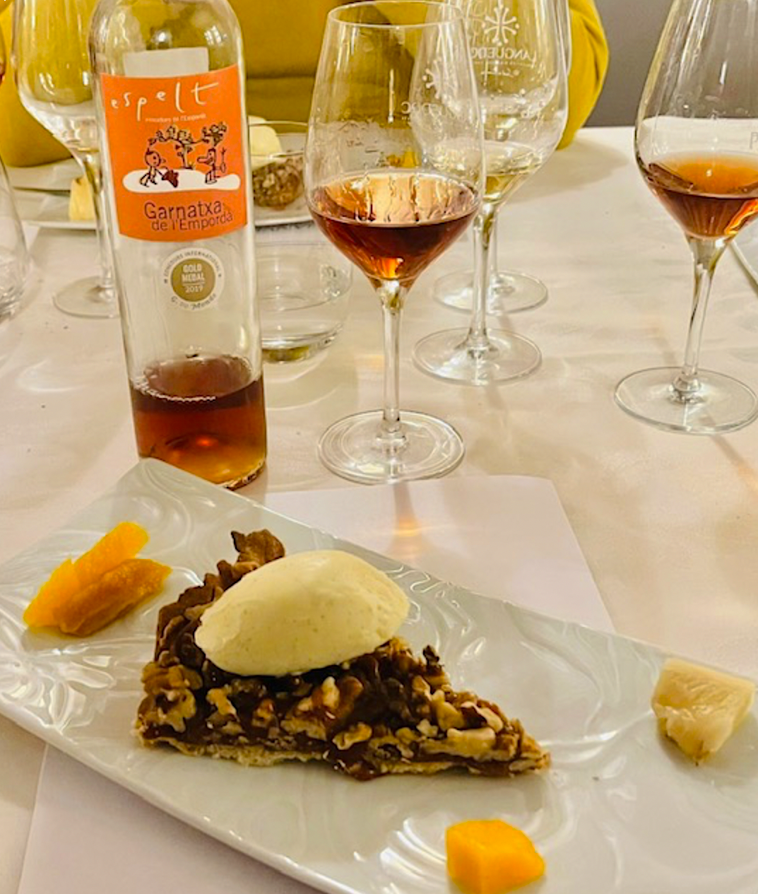 Tarte aux noix et caramel moelleux, confit d’orange
