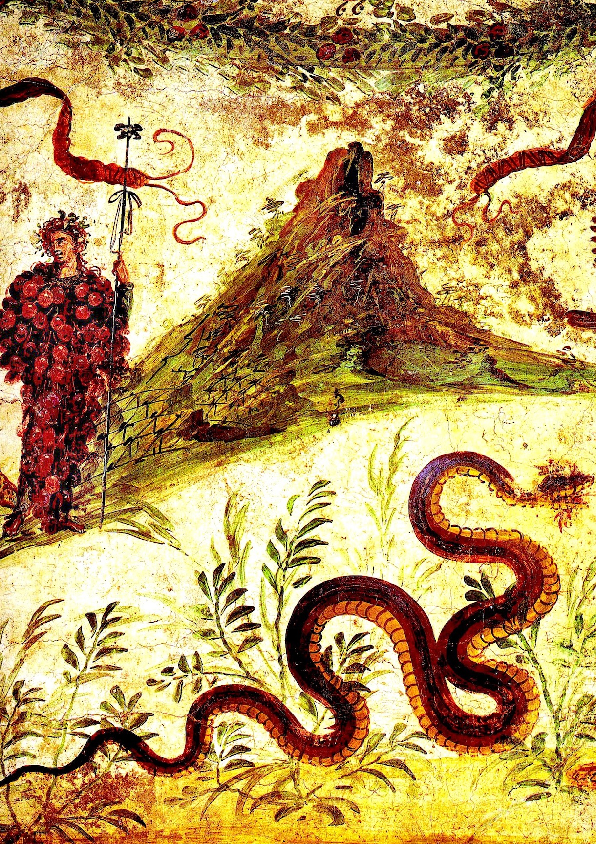 Ces versions chétiennes, héritières de la mythologie païenne, sont bien enracinées depuis les premiers établissements humains. Comme le montre la fresque de “ Bacchus sur le Vésuve ” conservée dans la maison du centenaire à Pompéi et ses innombrables traces dans les ruines de la ville qui ont survécu à l’éruption de l’an 79