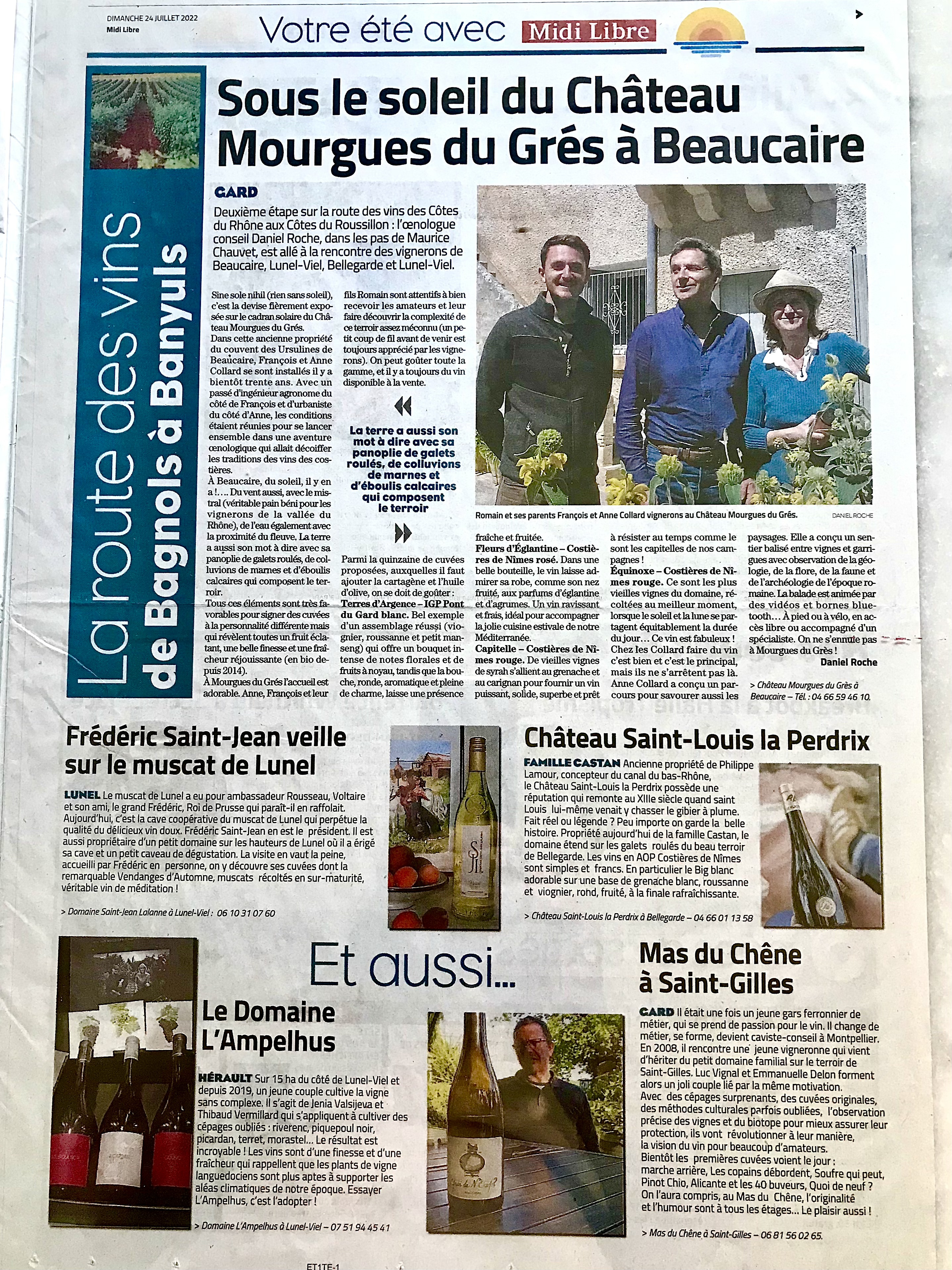 Dans cette ancienne propriété du couvent des Ursulines de Beaucaire, François et Anne Collard se sont installés il y a bientôt trente ans. Avec un passé d’ingénieur agronome du coté de François et d’urbaniste du côté d’Anne, les conditions étaient réunies pour se lancer ensemble dans une aventure œnologique qui allaient décoiffer les traditions des vins des costières. À Beaucaire, du soleil, il y en a, du vent aussi, avec le mistral (véritable pain béni pour les vignerons de la vallée du Rhône), de l’eau également avec la proximité du fleuve. La terre a aussi son mot à dire avec sa panoplie de galets roulés, de colluvions de marnes et d’éboulis calcaires qui composent le terroir. Tous ces éléments sont très favorables pour signer des cuvées à la personnalité différente mais qui révèlent toutes, un fruit éclatant, une belle finesse et une fraîcheur réjouissante (en bio depuis 2014).
