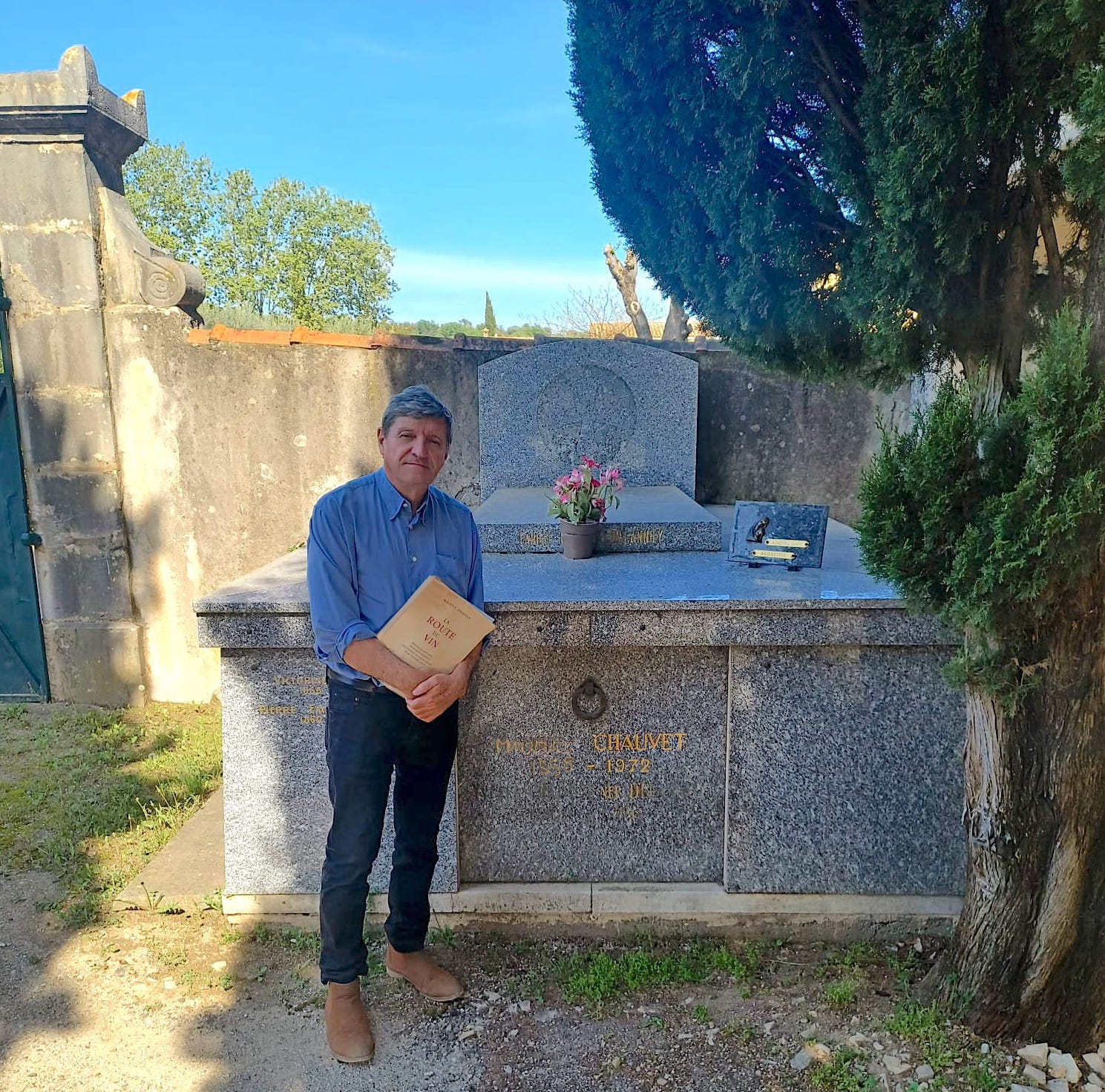 Un petit détour nous fait obliquer par Claret, comme un passage obligé dans notre voyage. C’est ici, dans le petit cimetière du village, que repose Maurice Chauvet décédé à l’âge de 74 ans. Nous sommes venus lui rendre un petit hommage, car sans lui et sans son livre nous ne serions certainement pas là, à vivre et profiter des paysages, des vins et de l’accueil tellement sympathique des vignerons. Après un moment de recueillement, sous le cyprès odorant, dans le silence du lieu agrémenté juste de douces stridulations d’un criquet, je me lance dans un petit discours par la lecture de quelques lignes de Jean Giono tirées de la préface du livre…