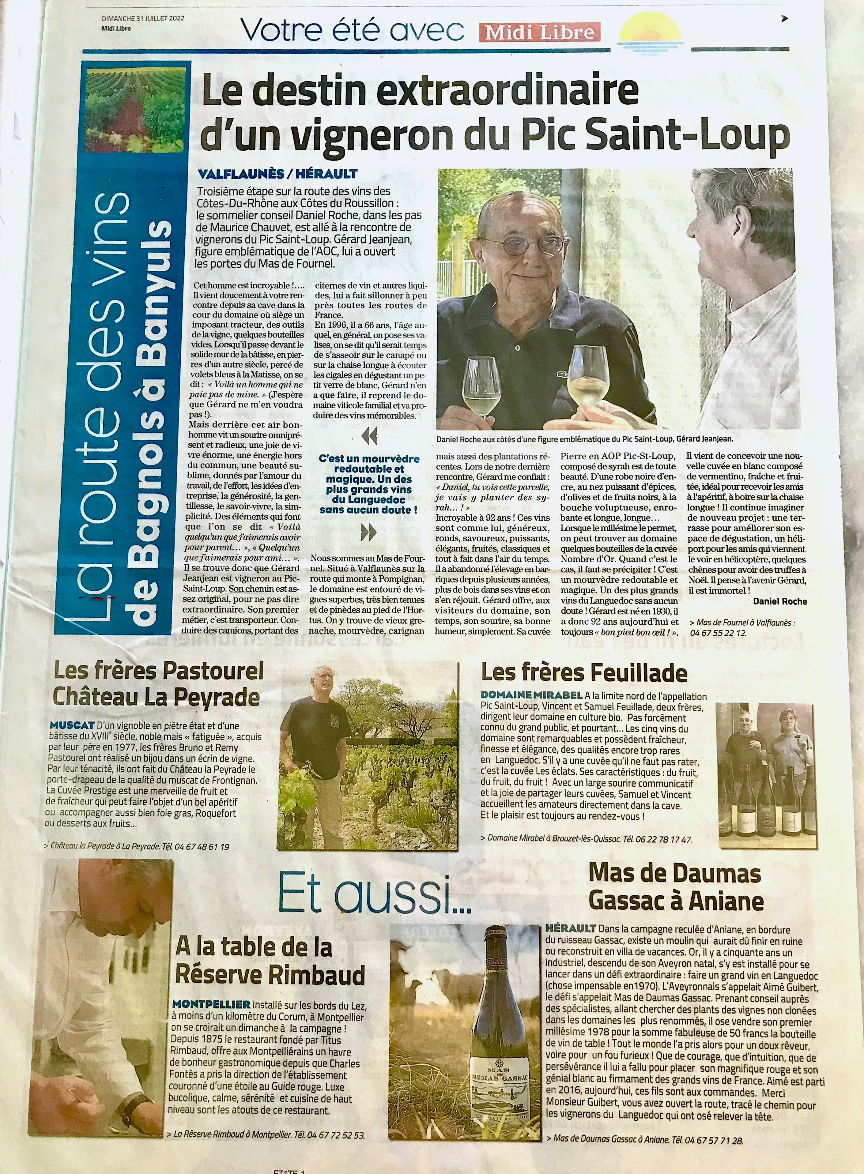 Nous sommes au Mas de Fournel. Situé à Valflaunès sur la route qui monte à Pompignan, le domaine est entouré de vignes superbes, très bien tenues et de pinèdes au pied de l’Hortus. On y trouve de vieux grenache, mourvèdre, carignan mais aussi des plantations récentes. Lors de notre dernière rencontre, Gérard me confiait : « Daniel, tu vois cette parcelle, je vais y planter des syrah… ! » incroyable à 92 ans !