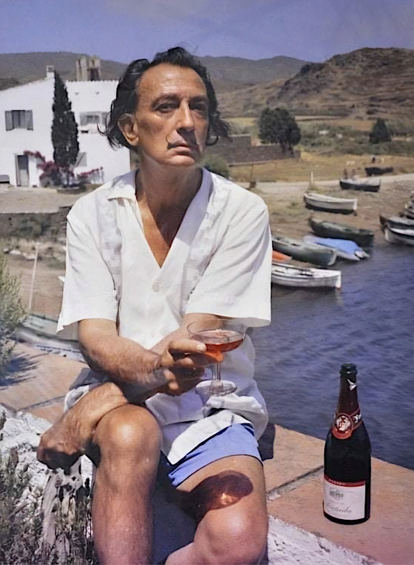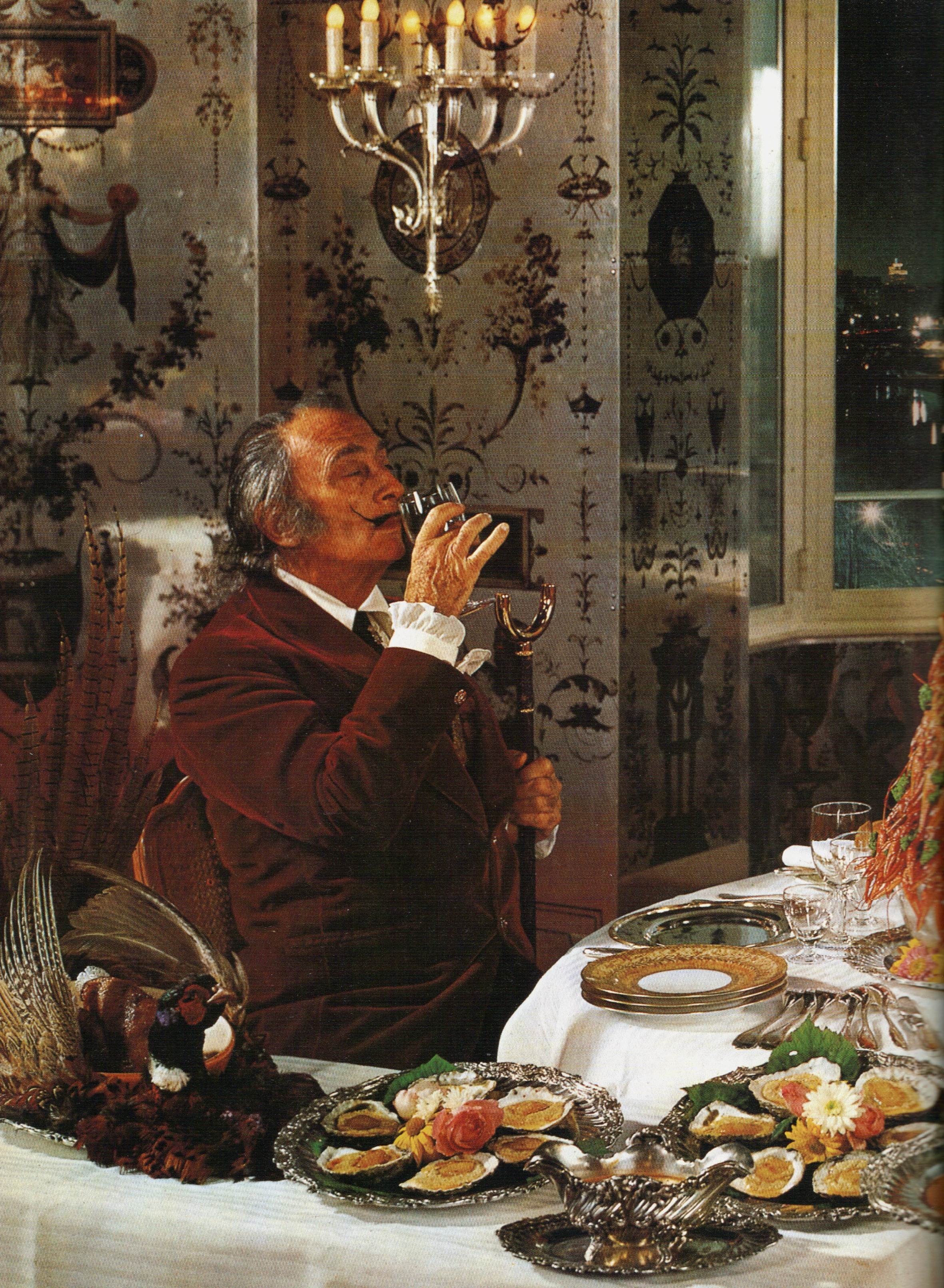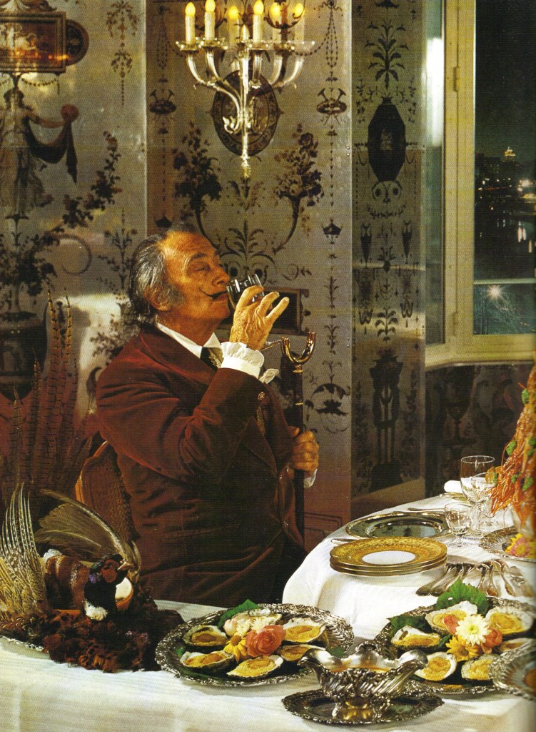 « Chaque fois que le sommelier s’approchait de mon oreille pour me murmurer très bas et sur le ton d’une confidence le nom et l’année du vin, je croyais qu’il s’agissait de quelque chose de grave, que Gala avait été renversée par un taxi, qu’un surréaliste furieux arrivait pour me rosser, et je sursautais, livide, prêt à quitter la table. Mais non, ce n’était rien. Le sommelier répétait plus haut pour me rassurer, avec le maximum de dignité figée : « Châteauneuf du Pape 1923… . » Salvador Dali